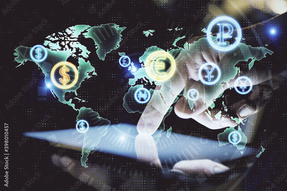 Double exposure of man's hands holding and using a digital device and forex graph drawing. Financial market concept.