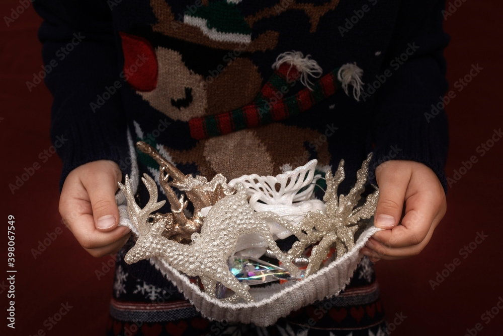 Set of Christmas decorations in children's hands. Christmas toys in a sweater