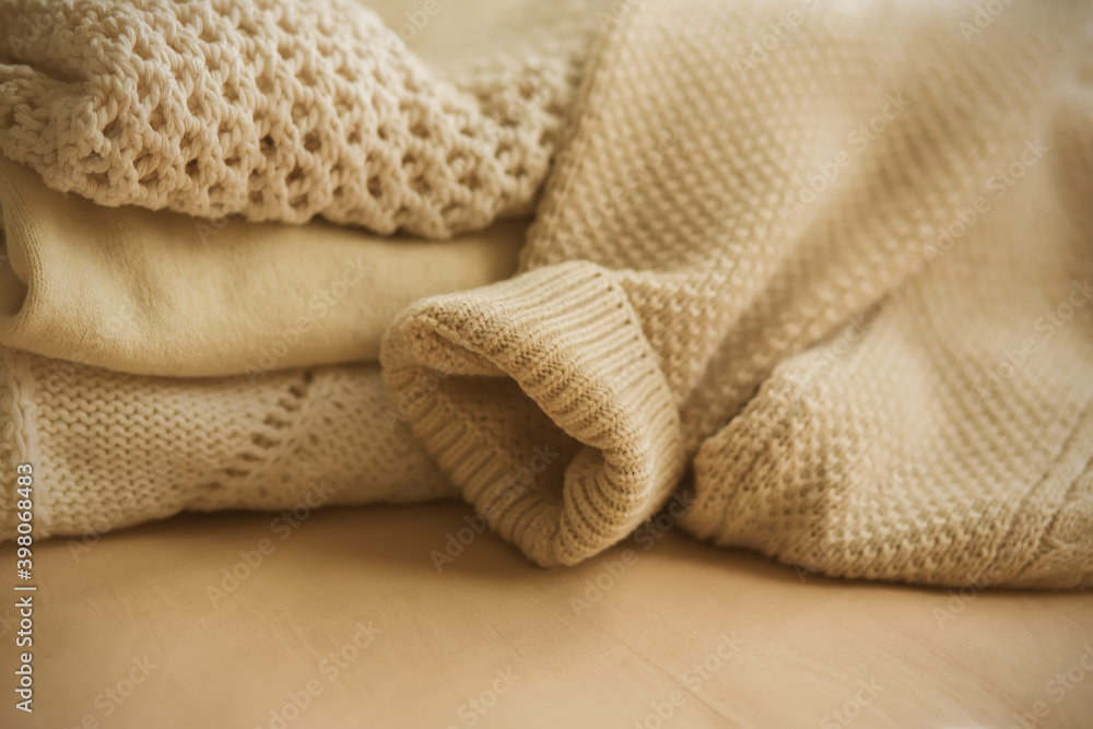 Beige wool warm sweaters lie on the bed, folded in a pile, from which the sleeve of one of the sweaters has fallen. Warm clothing for cold autumn and winter.
