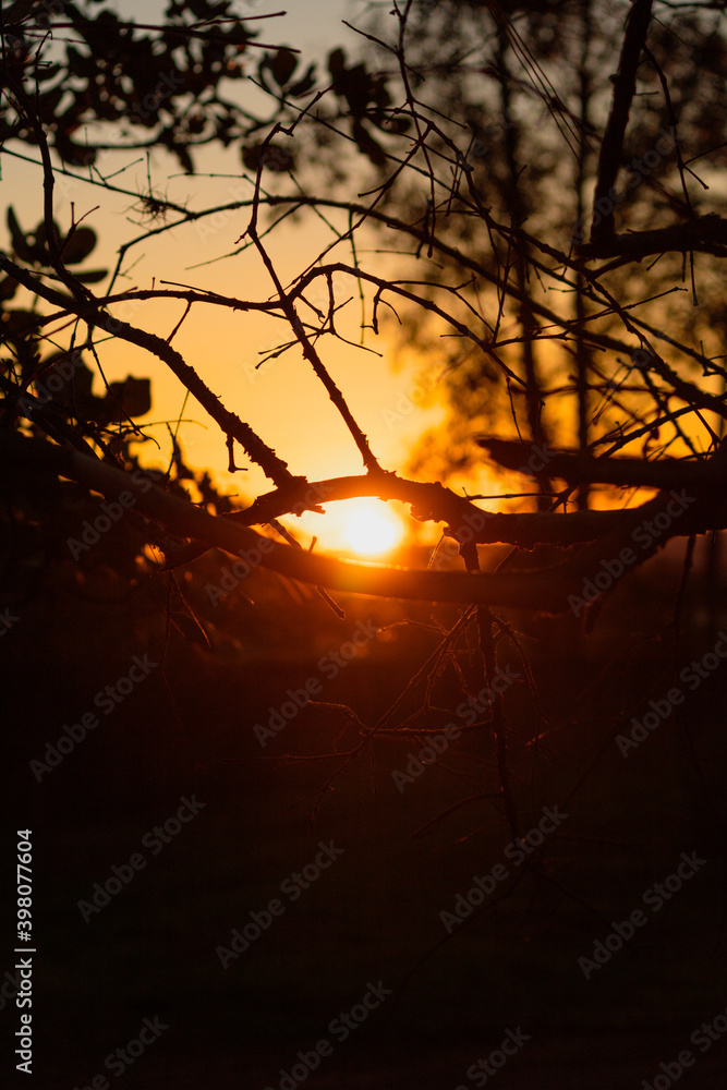 Sun through the branches on the farm