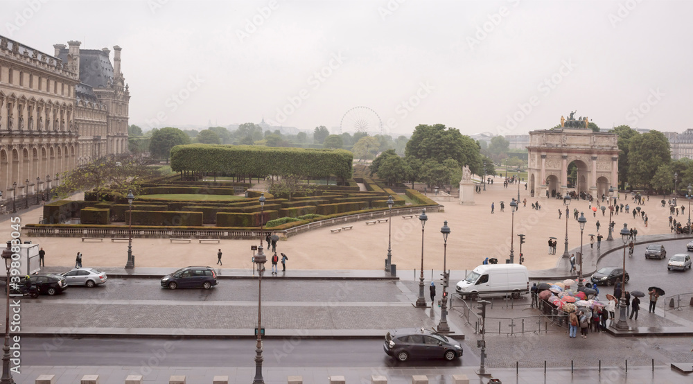View from the second floor of the Louvre to the Place du Carrousel.It's raining