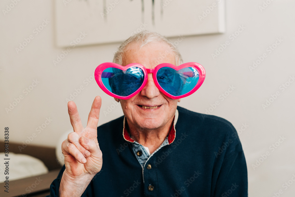 Happy elderly man portrait with heart shaped glasses at home, love concept
