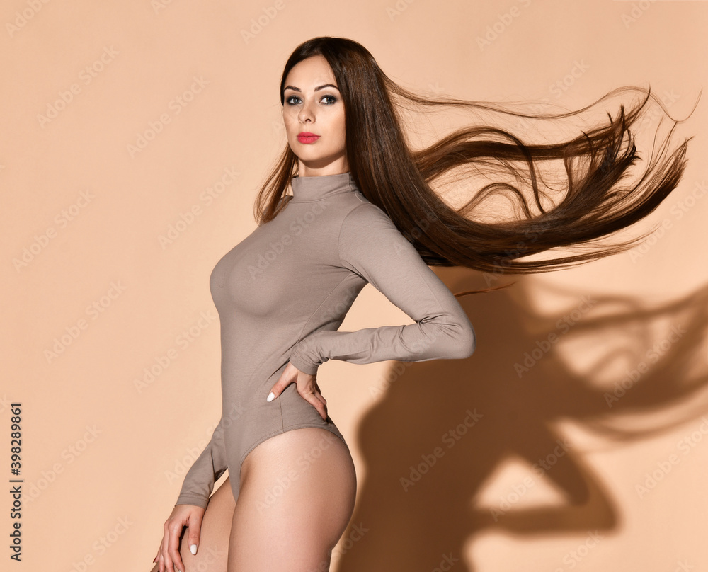 Young pretty sexy woman model with long flying straight hair in beige body with perfect lines standing and posing over pastel background. Fashion, stylish look for women, sexy elegant wear concept