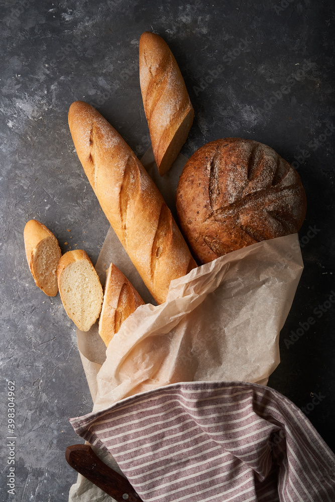 Fresh homemade bread, French baguettes, gluten-free gray bread