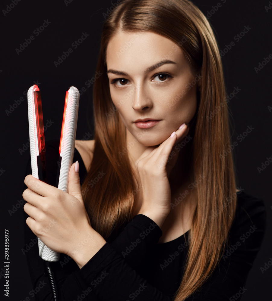 Young beautiful woman with long silky well-groomed straight hair in black bodysuit holding hand at her chin demonstrates hair straightener over dark background. Haircare, beauty, wellness concept