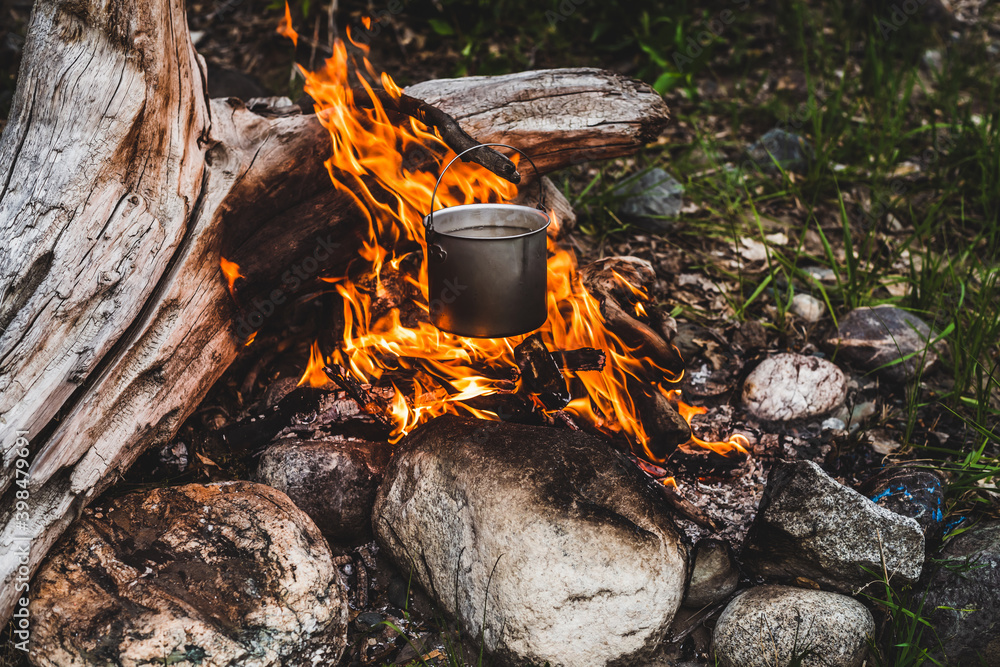 Kettle hanging over fire. Cooking food at fire in wild. Beautiful big log burns in bonfire close-up. Survival in wild nature. Wonderful flame with caldron. Pot hangs in flames. Campfire background.