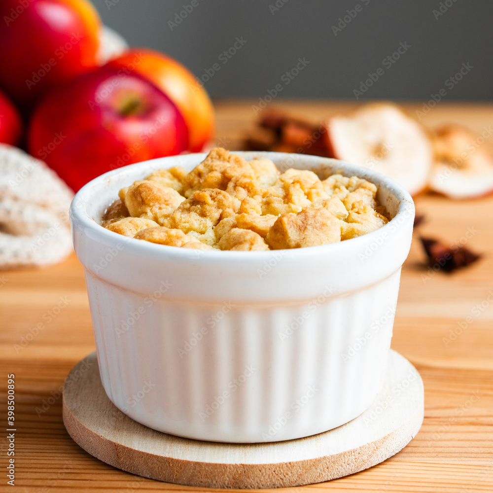 Fresh Organic healthy vegetarian vegan homemade red apple fruit pie crumble cake delicious dessert bake pastry with vanilla ice cream cinnamon for Christmas and autumn season