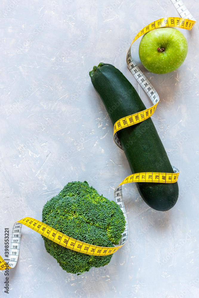 Zucchini, green apple and broccoli and centimeter. Fresh fruits and vegetables, concept for weight loss, diet, ketogenic diet, intermittent fasting