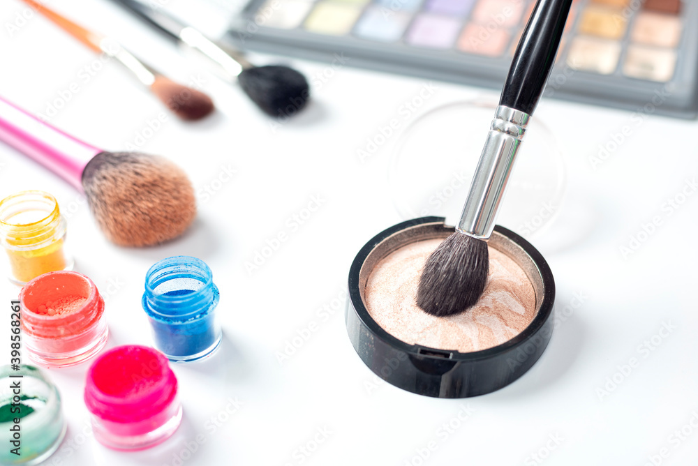 makeup artist hands with brushes and cosmetics for makeup with variety of products and brushes.