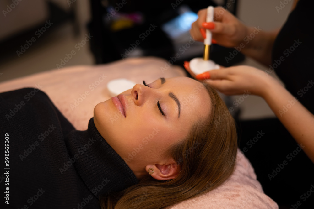 Eyelash extension performed at clinic by master on a client in a beauty salon