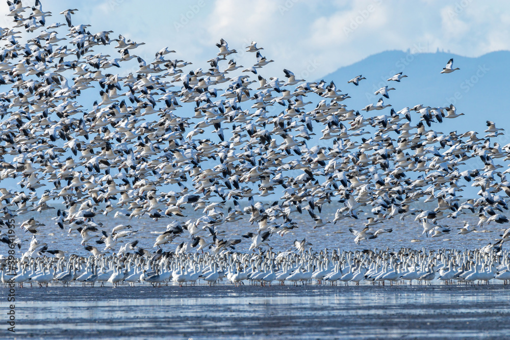 massive flock of snow geese took flight on the coast with mountain range over the horizon in the background