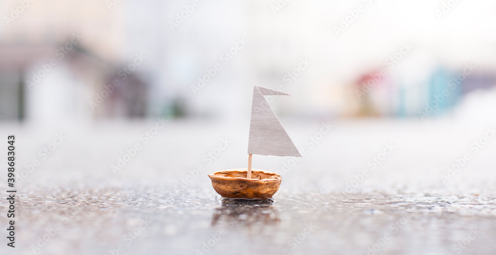 A small boat made of nut shell sailing on street. Kleines Boot aus Nussschale schwimmt auf der Straße.