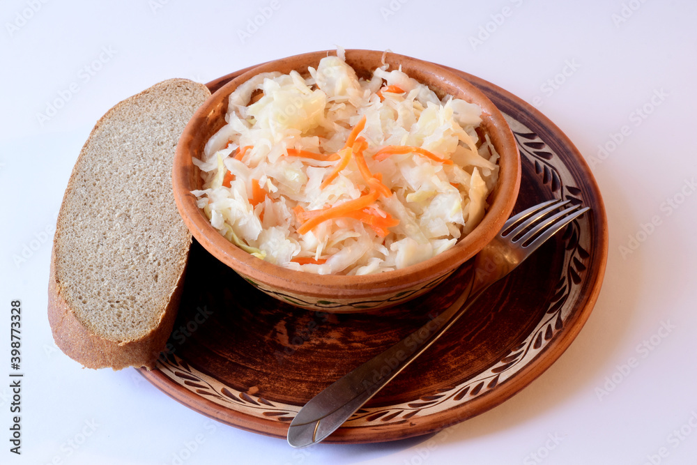 Sauerkraut with carrots in a clay plate and a piece of bread are on the table.