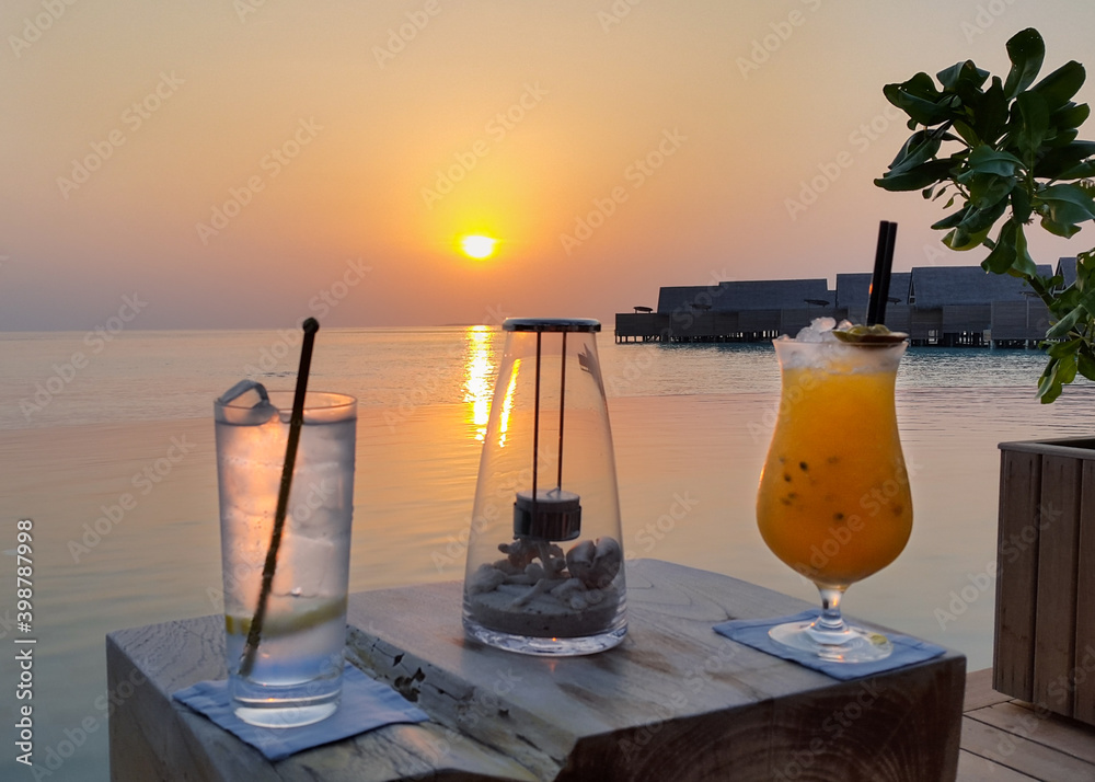 Cocktails beim Sonnenuntergang auf den Malediven (Sundowner), Gin Tonic und Maracuja-Cocktail