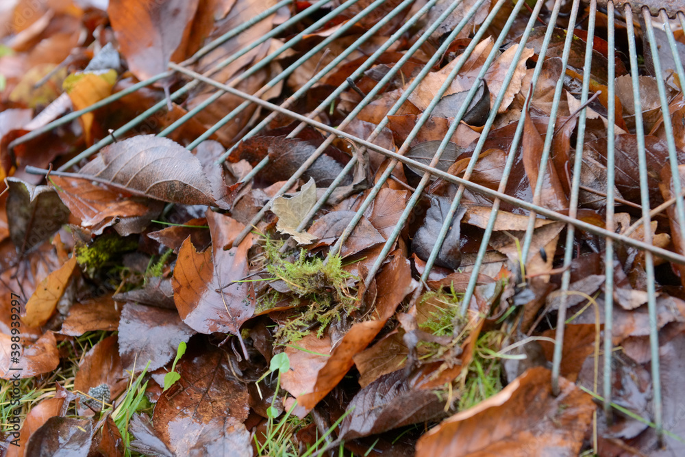 Close up of the head and tines of a garden rake sweeping brown leaves