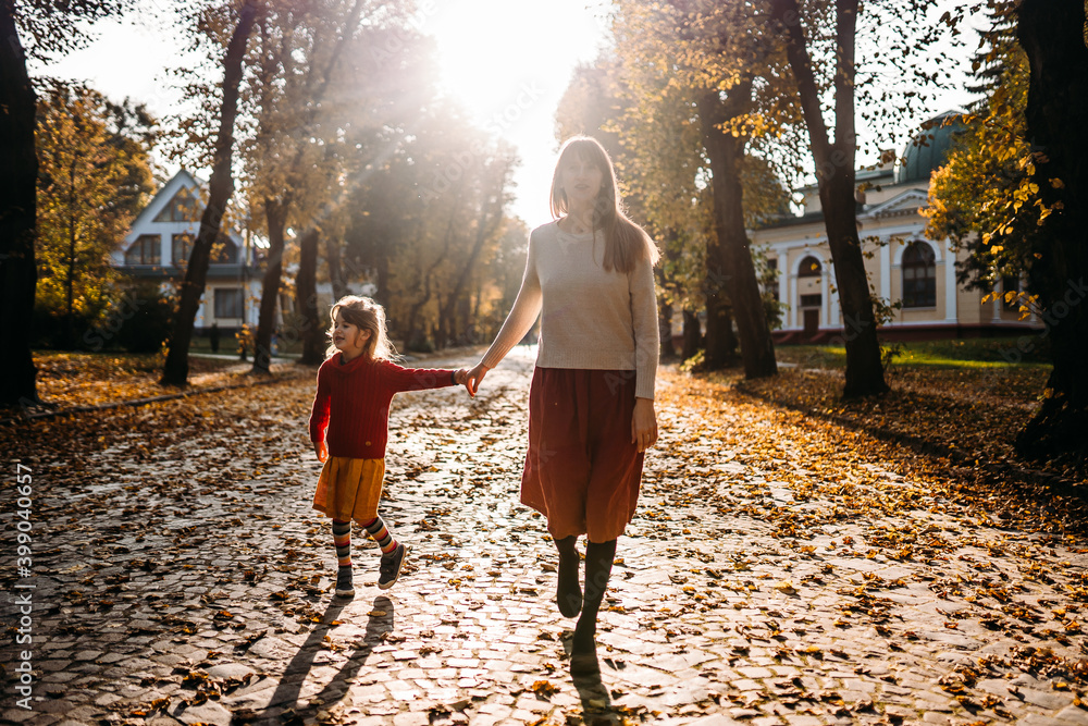 Mom and daughter walk in the park by the hand in autumn with yellow leaves, support for parents and children in single-parent families