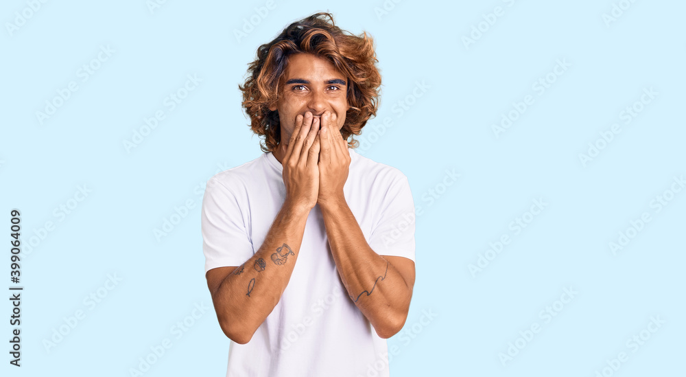 Young hispanic man wearing casual white tshirt laughing and embarrassed giggle covering mouth with hands, gossip and scandal concept