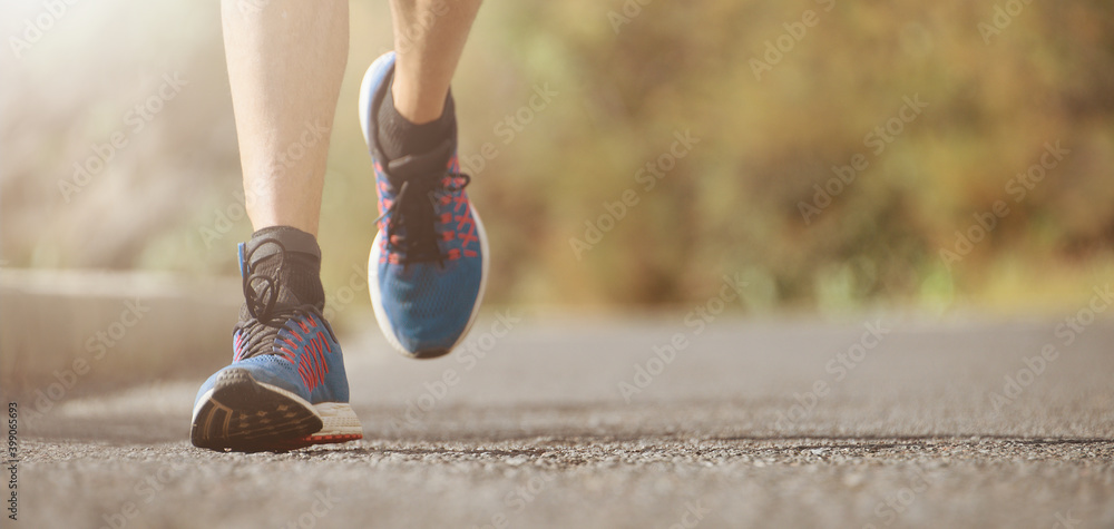 Fitness man runner athlete running at road, working out cardio on nature landscape