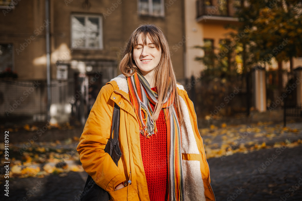 sunny portrait of a young woman in autumn in the park outdoors