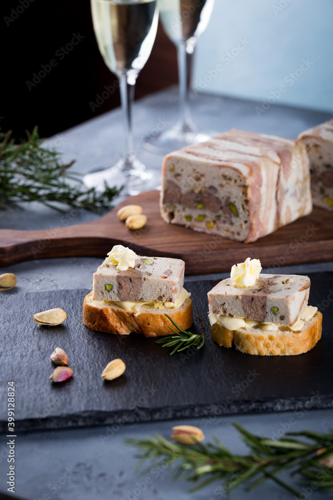 Christmas tapas with terrine on bread toast with butter, New year celebration with white wine, delicious snack for party dinner