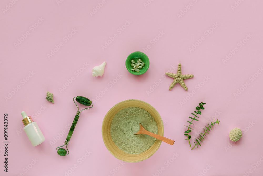 Natural organic cosmetics: bowl with clay, cosmetic oil bottle, face roller and eucalyptus leaves on pink background