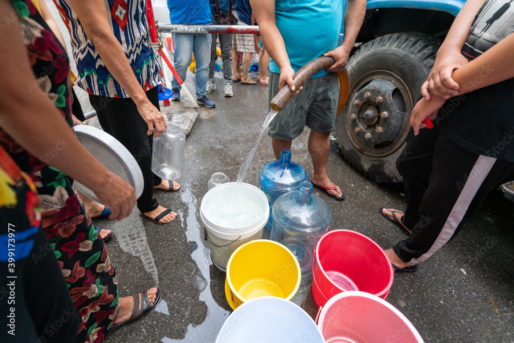Empty water buckets waiting for fresh water from emergency mobile tank truck