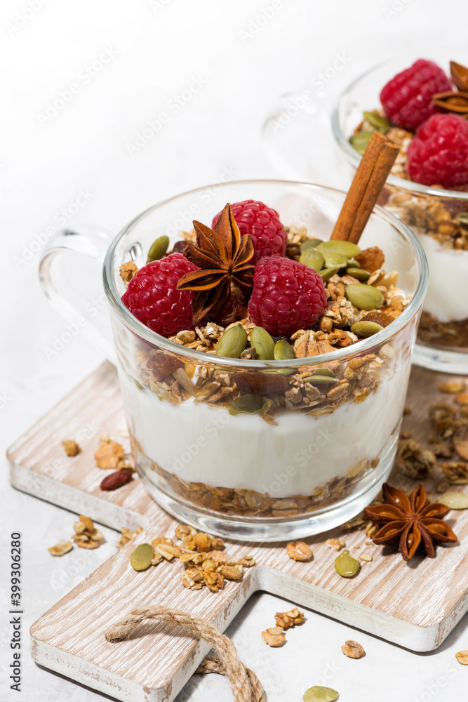 spicy dessert with sweet granola and yogurt on wooden board, vertical