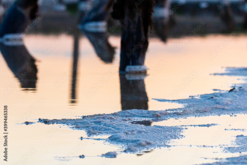 Salt on wooden log in water salt lake. Salt Lake Baskunchak, Russia