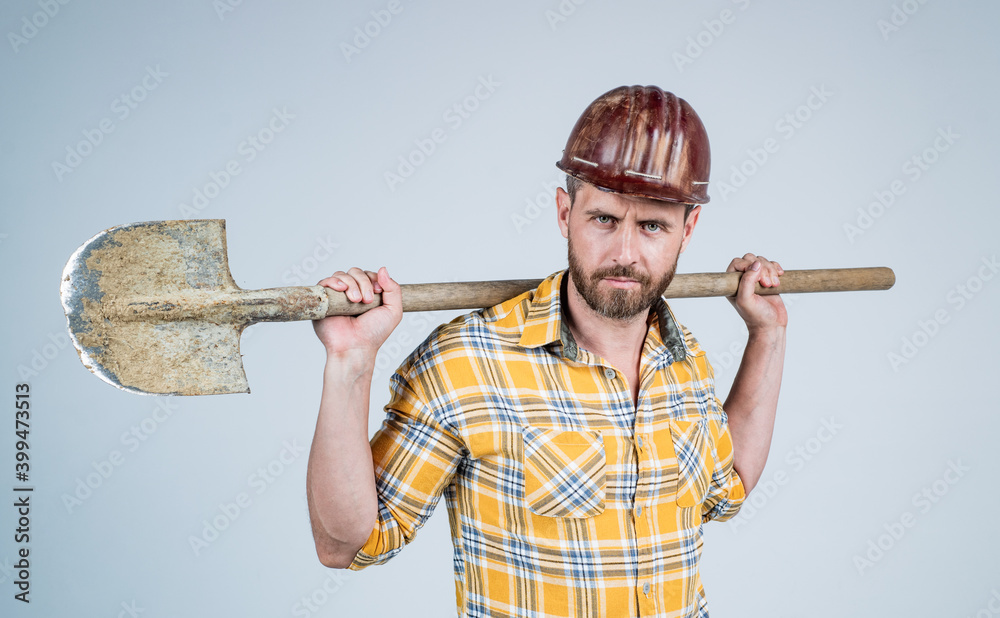 He loves his job. mature builder in shirt. unshaven man on construction site. handsome building worker in hard hat. labor day. guy wear safety helmet hold shovel. engineer on work. male lifestyle