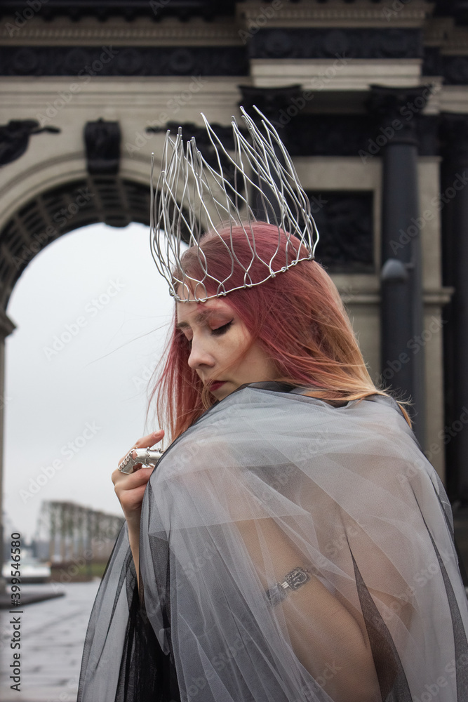 Russia, Moscow - 28/11/2020: Girl with pink hair in a dress and crown in the city.