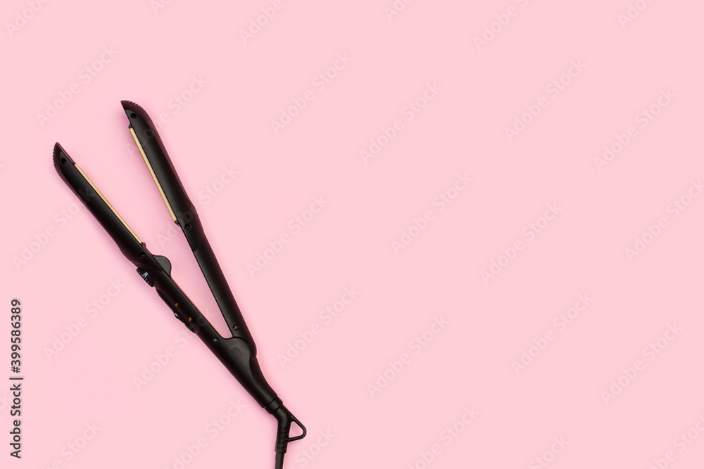 Plancha de pelo sobre un fondo rosa liso y aislado. Vista superior. Copy space. Concepto: Cuidado del cabello, peinado, salón de belleza, peluquería.