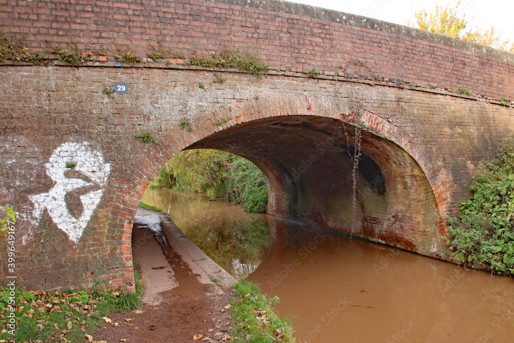 A bridge spans the murky water in autumn on the Bridgewater and Taunton canal in Somerset