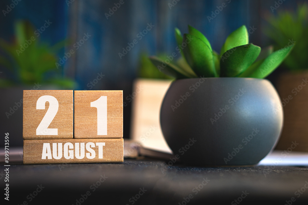 august 21st. Day 20 of month, Cube calendar with date and pot with succulent placed on table at home Simple calendar. summer month, day of the year concept