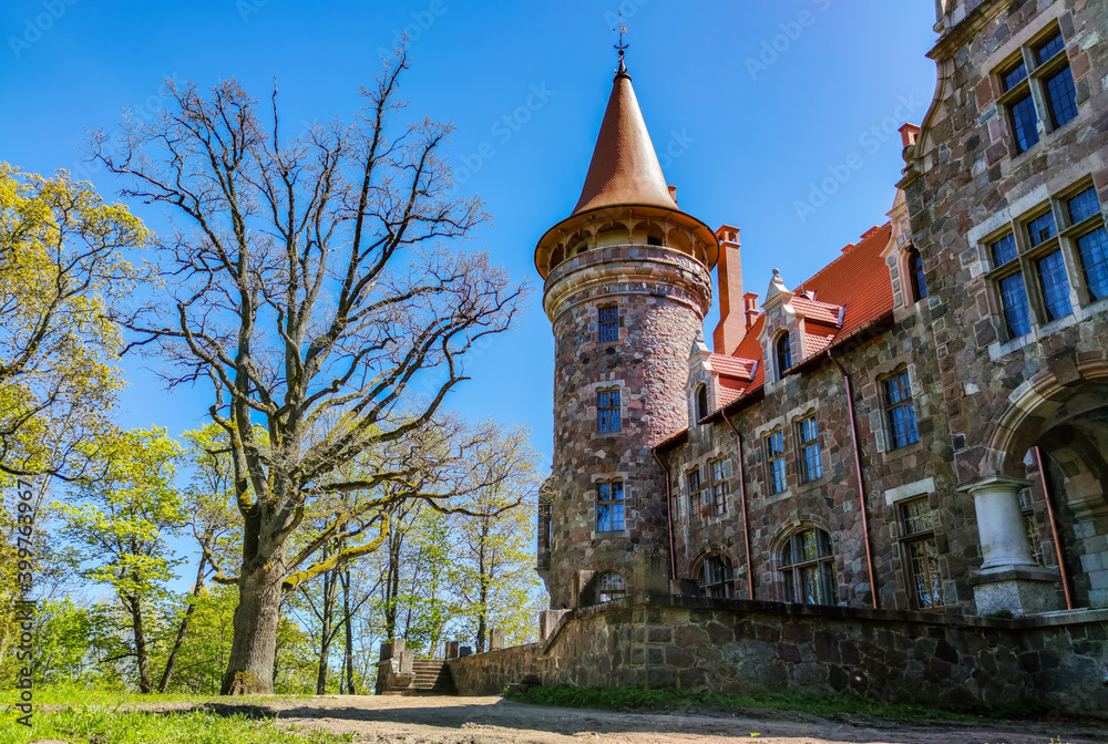 Latvia: Cesvaine castle - a manor house of the late 19th century, a building of stones of different colors with a brown tiled roof, tree without leaves, green grass.