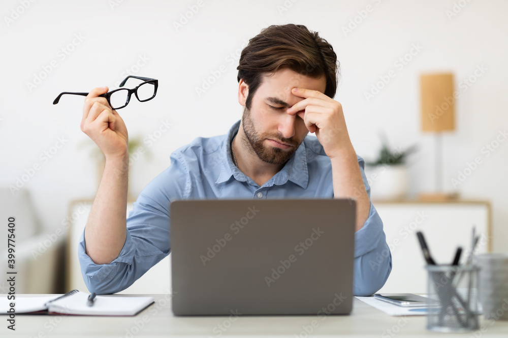 Tired Man At Laptop Massaging Nosebridge Holding Eyeglasses In Office