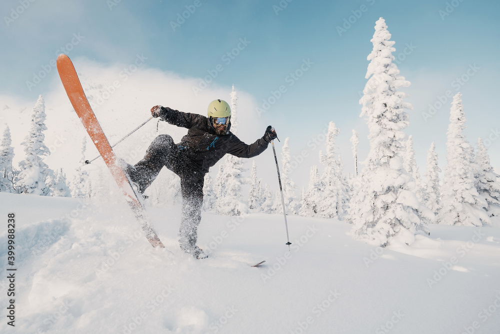 Happy male skier standing on fresh snow powder between snow-covered trees forest. Sunny winter day and free ride in ski-resort