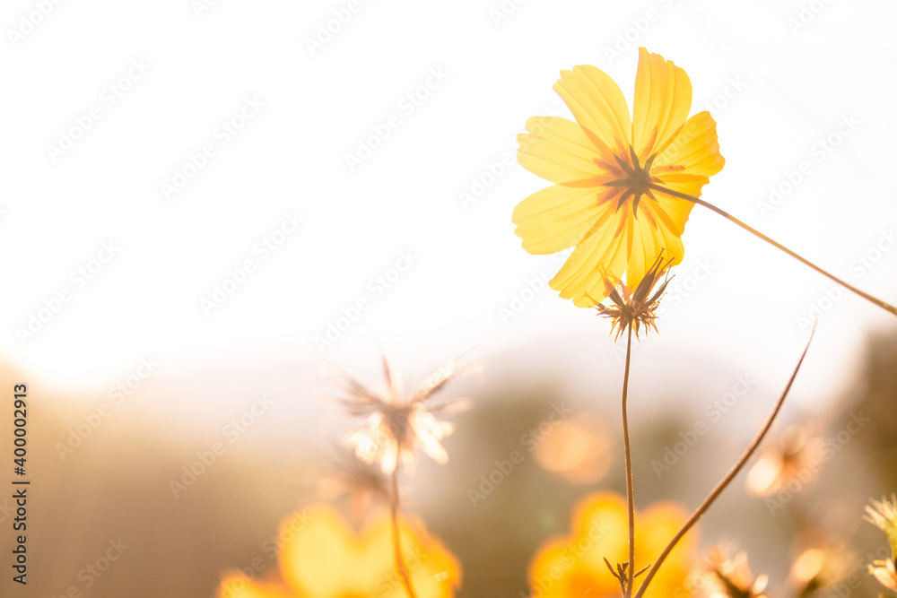 Floral background in soft orange tones and vintage blur style. Small yellow flower blow by the wind. Concept of feel free and release. Free copy space on left for text or design
