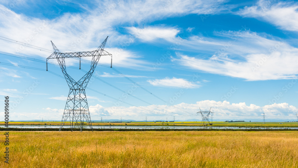 Power lines in a rural grass field. Tall steel power poles and pylons under a bright blue sky Alberta landscape. Energy supply and technology concept