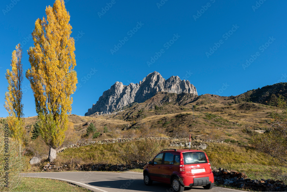 Red car running in small road with yellow poplar tree and mountain peak background in Spain