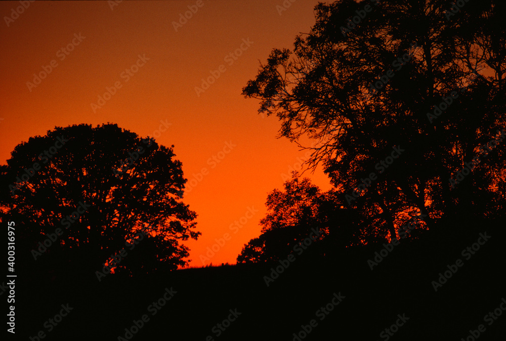 Oregon White Oaks with orange sky at sunset. Willamette Valley, Oregon
