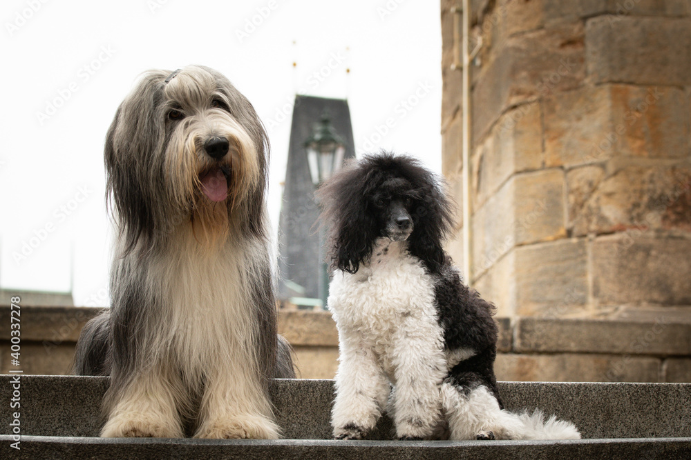 Bearded collie and puppy of poodle are sitting in city center. They were in center of Prague. She is so patient model.