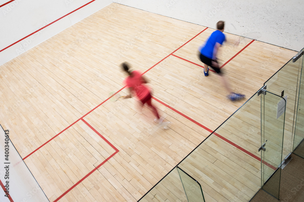 Squash players in action on a squash court (motion blurred image; color toned image)