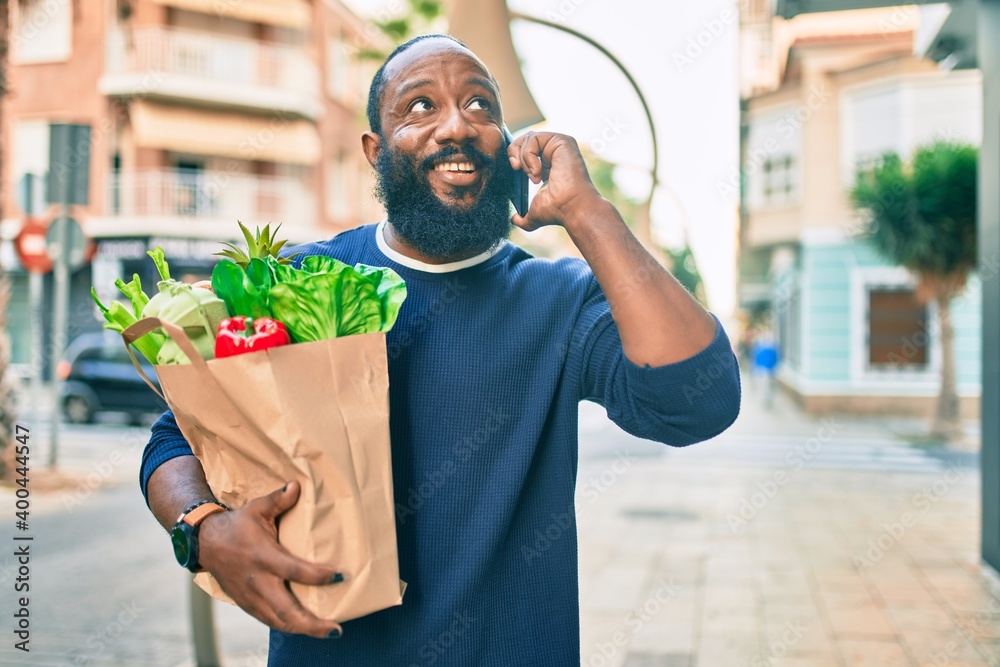 African american man with beard holding paper bag of groceries from supermarket speaking on the phone