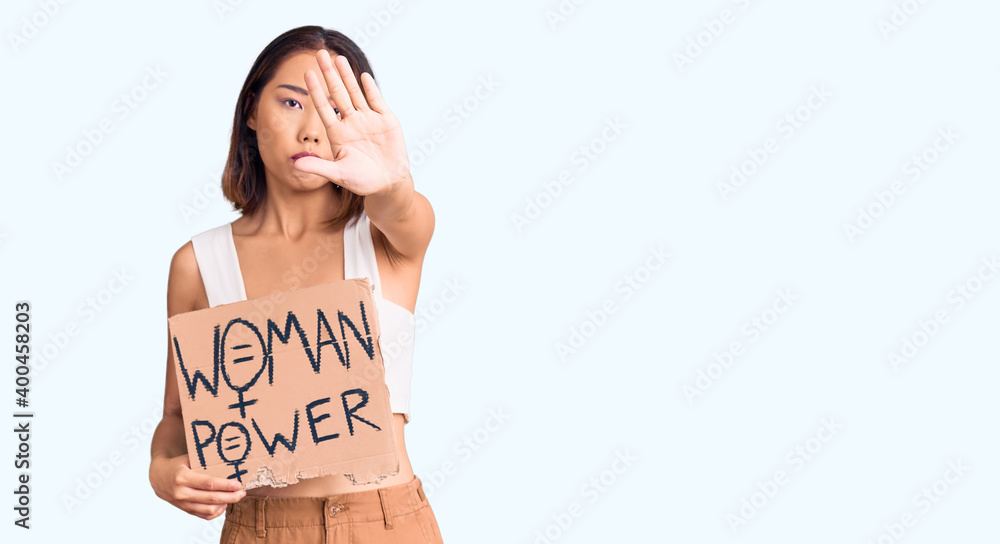 Young beautiful chinese girl holding woman power banner with open hand doing stop sign with serious and confident expression, defense gesture