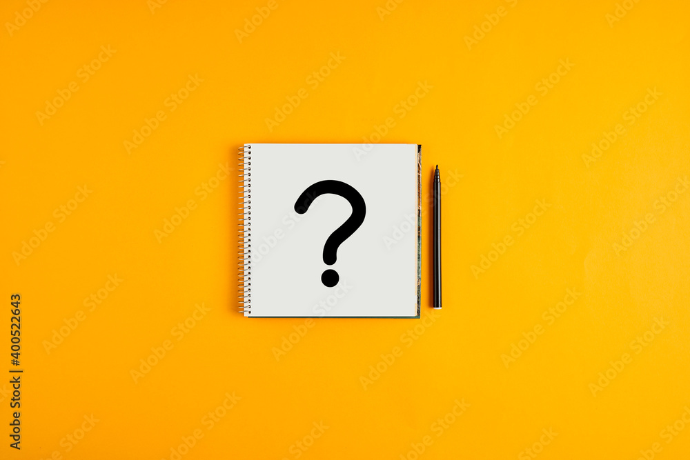 Question mark drawn on a notepad with black pen next to it against yellow background
