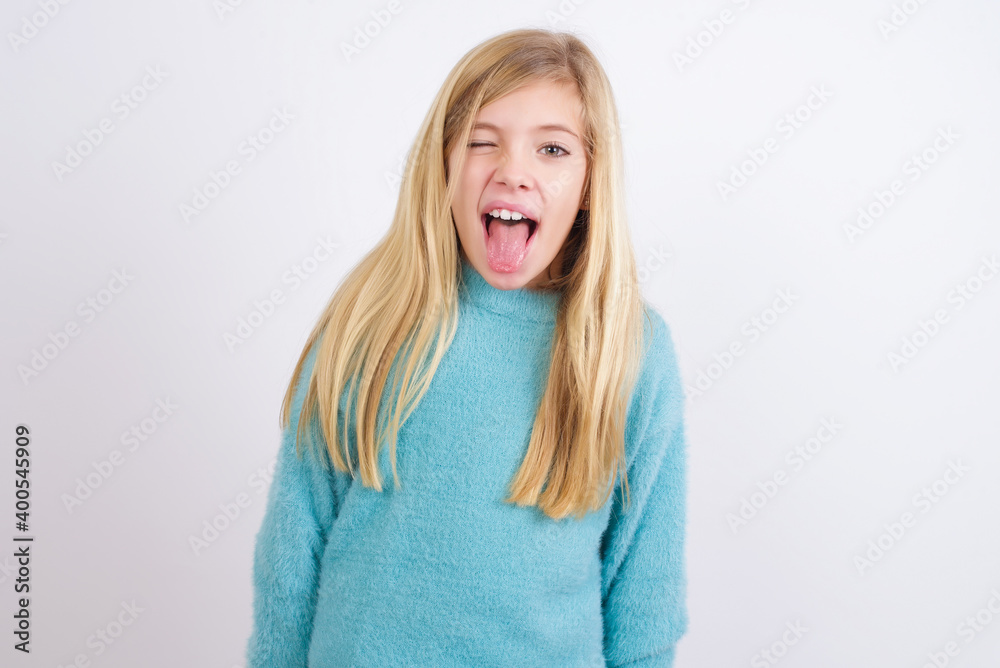 Cute Caucasian kid girl wearing blue knitted sweater against white wall with happy and funny face smiling and showing tongue.