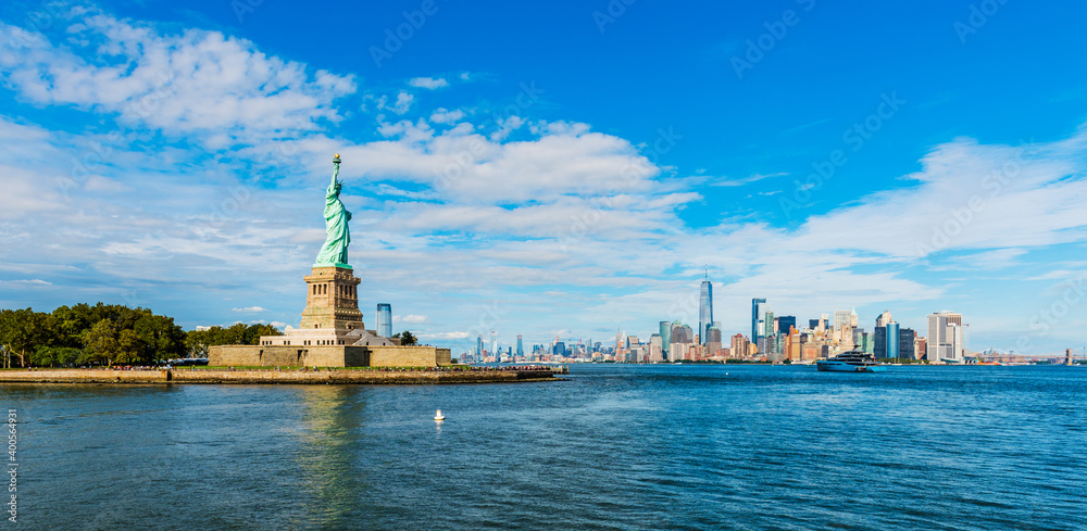 Statue of Liberty National Monument with Manhattan skyline, New York.
