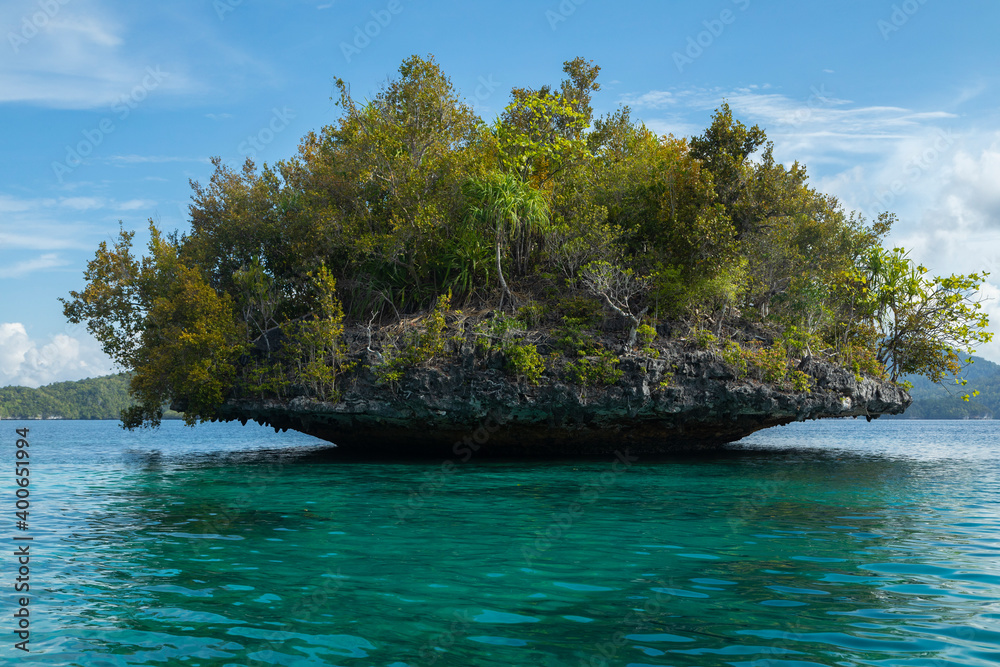 Small tropical island, weathered by sea water, covered with lush vegetation, off the beautiful and heavenly shores of Gam Island in Raja Ampat, West Papua, Indonesia.