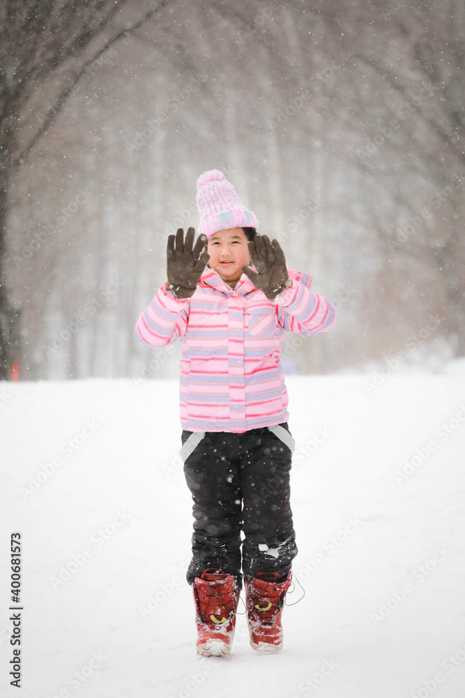 Asian girls playing snow happily in japan. , Children playing in the snow ,