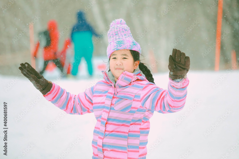 Asian girls playing snow happily in japan. , Children playing in the snow , Children playing in the snow happily.Asian boy playing snow happily in japan.